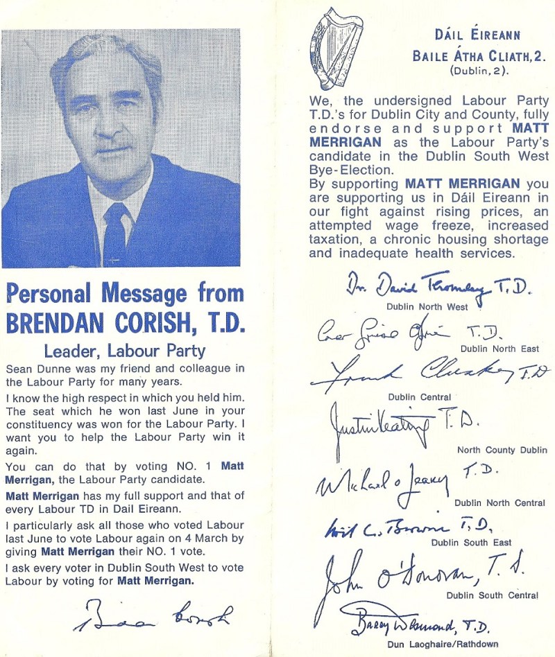 From the 1970 Dublin South West By-Election a leaflet from Matt Merrigan running for Labour. The By-election came about due to the death of Labour TD Sean Dunne. The leaflet contains a profile of Matt Merrigan, a message from John O’Connell (Labour TD for Dublin South West) , a message from Brendan Corish as well as an endorsement from all the Dublin based Labour TD’s.