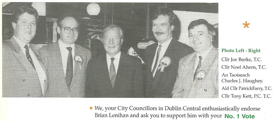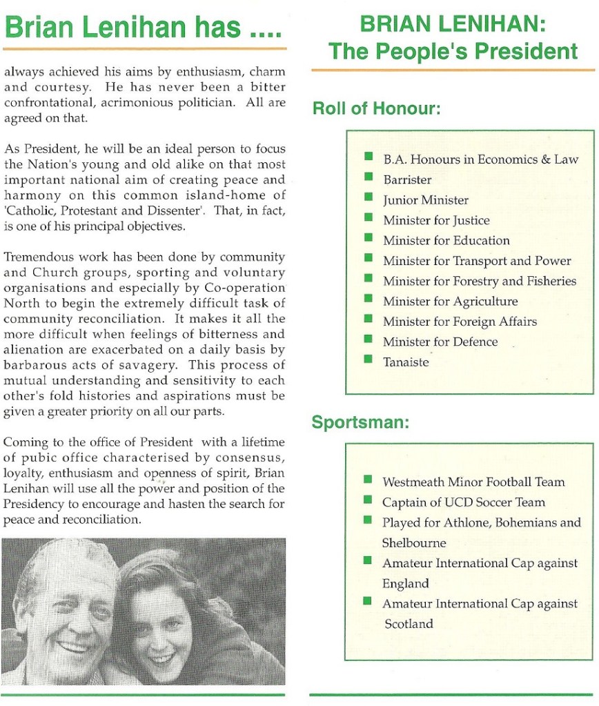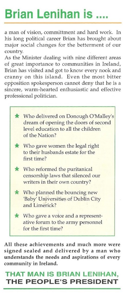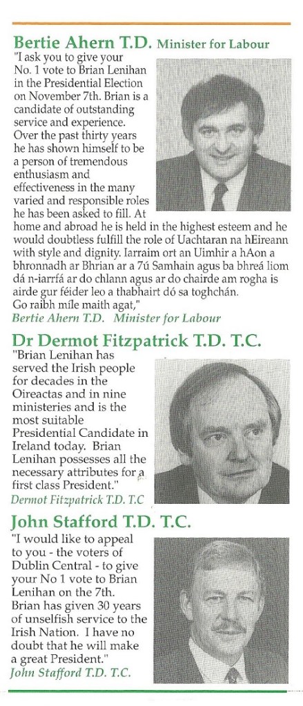 From the 1990 Presidential Election a leaflet distributed in Dublin Central endorsing Brian Lenihan for President. It has messages of support from TD’s Bertie Ahern, Dermot Fitzpatrick and John Stafford as well as local Councillors. There’s also a profile of the candidate. Many thanks to the sender.