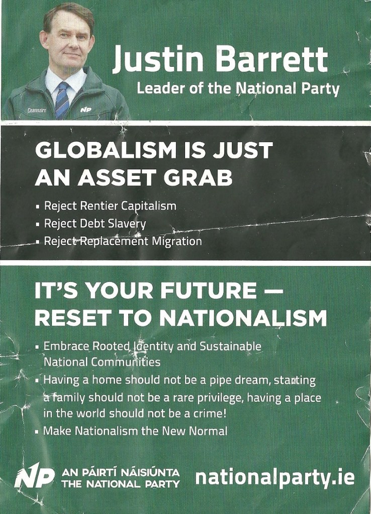 A Leaflet from Justin Barrett who is running for The National Party in the Dublin Bay South Bye-Election.