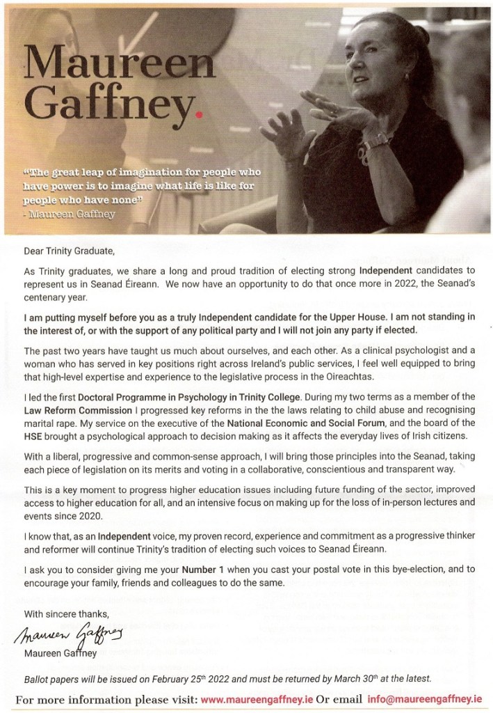 From the 2022 Trinity Seanad By-Election a leaflet from Maureen Gaffney. Many thanks to the sender.