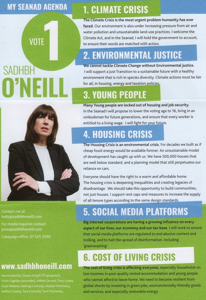 From the 2022 Seanad By-Election a leaflet from Sadhbh O’Neill. Many thanks to the sender.