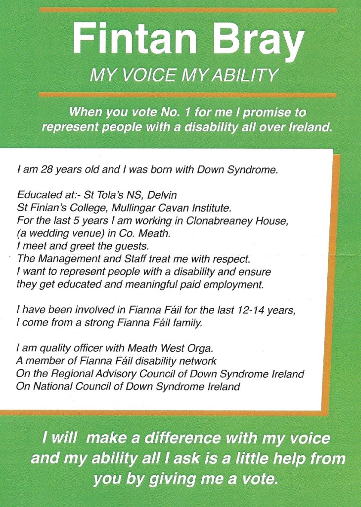 From the 2022 Fianna Fáil Ard Fheis, a leaflet from Fintan Bray who made History by being elected to the Fianna Fáil Committee of 15 (The Party National Executive) and thus becoming the first person with Down syndrome to be elected to a senior position in a political party in Ireland.