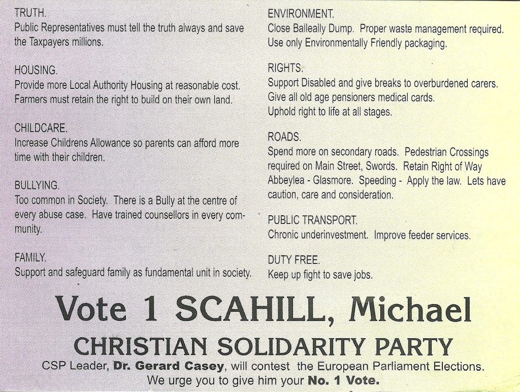 From the 1999 Local Elections a leaflet from Michael Scahill of The Christian Solidarity Party running in Swords. He polled 344 votes and missed out on a seat.