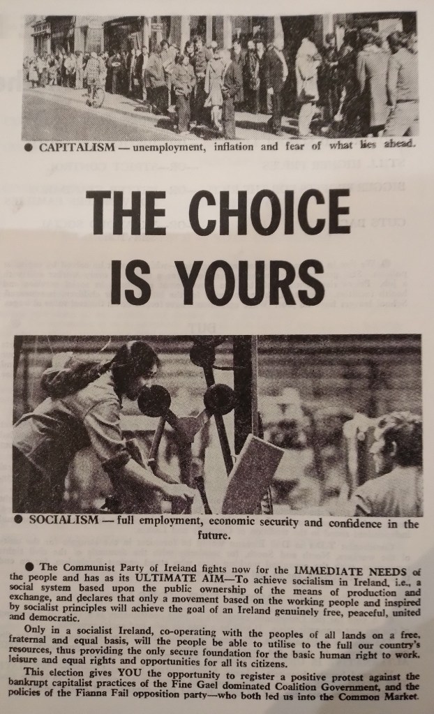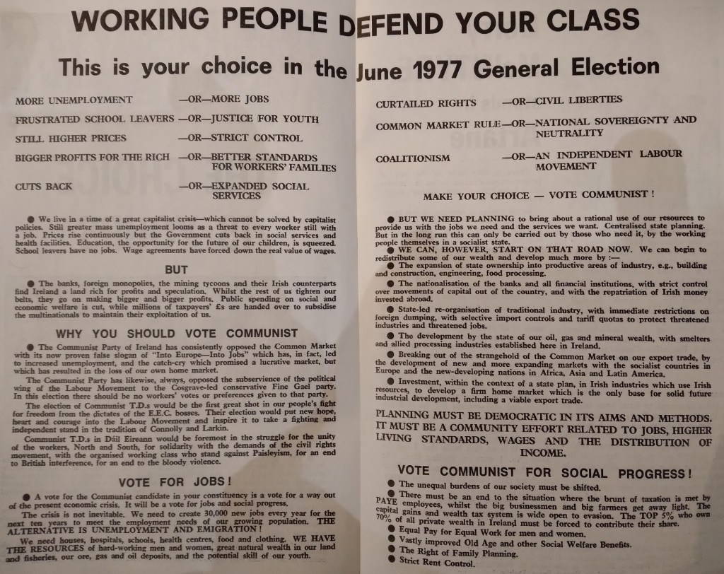 From The 1977 General Election a Leaflet from Gerry McIntyre running for The Communist Party of Ireland in Dublin Artane. He polled 227 votes and missed out on a seat.
