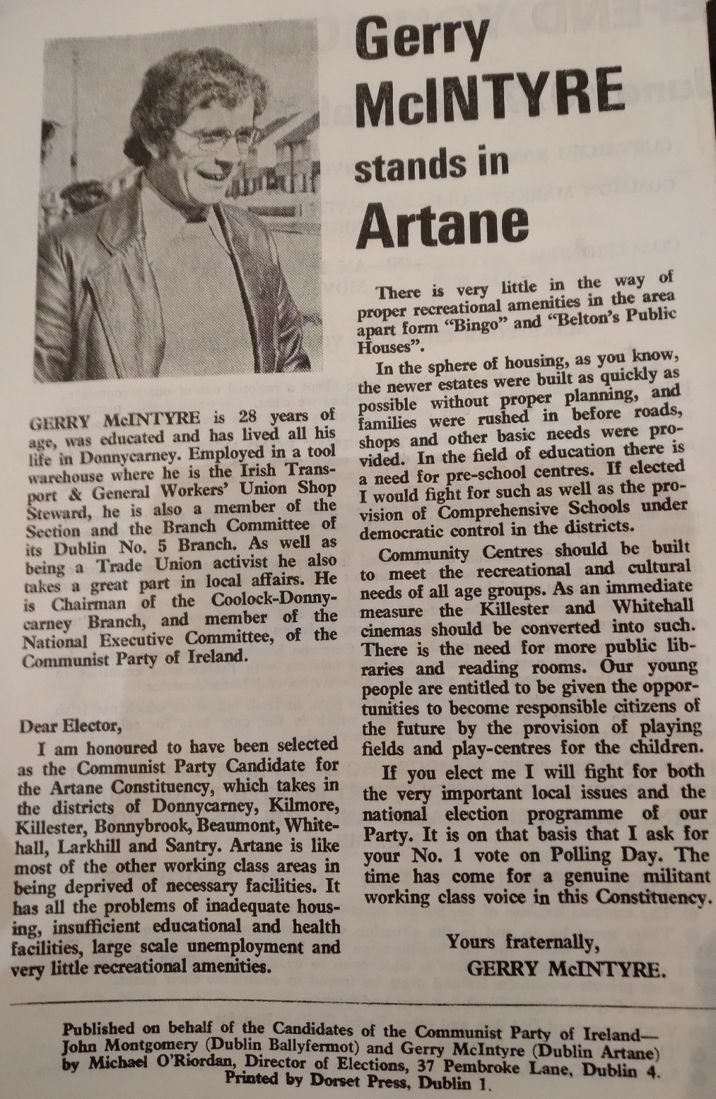 Leaflet from Gerry McIntyre – Communist Party of Ireland – 1977 General Election – Dublin Artane » gerrymcintyre1977a