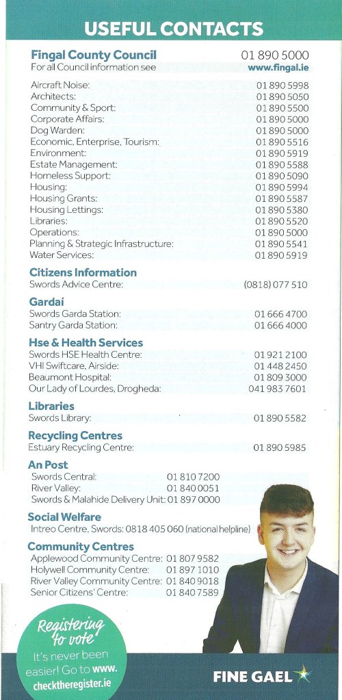 A leaflet from Luke Corkery who is the Fine Gael Local Area Representative in Swords.