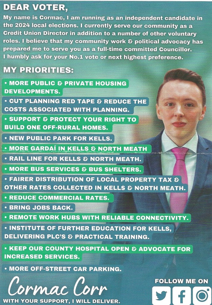 Leaflet from Cormac Corr -Independent – Kells – 2024 Local Elections #LE2024 December 17, 2023