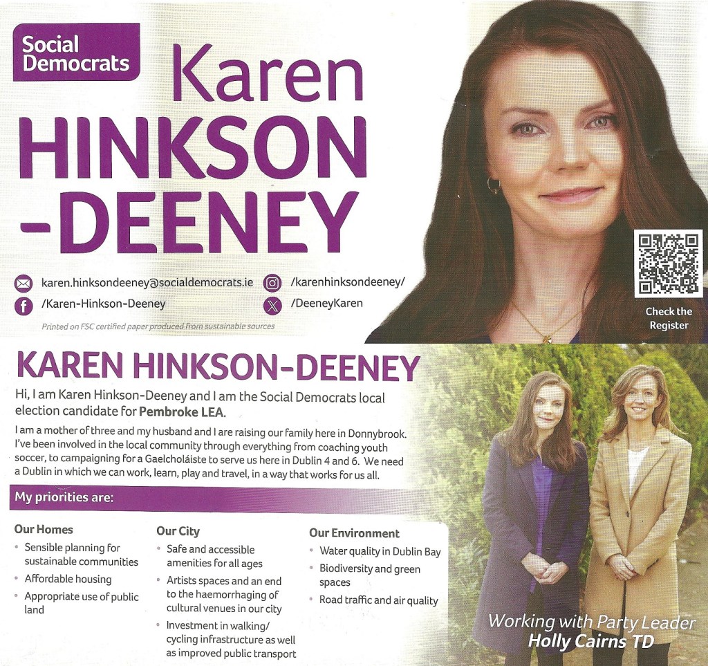 A leaflet from Karen Hinkson-Deeney who is running for the Social Democrats in Pembroke LEA in the 2024 Local Elections
