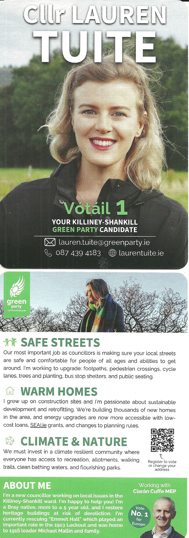 Leaflet from Lauren Tuite – Green Party – Killiney Shankill – 2024 Local Elections » laurentuite