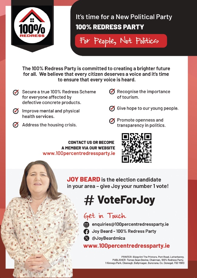 A leaflet from Joy Beard who is running for the 100% Redress Party in Buncrana in the 2024 Local Elections