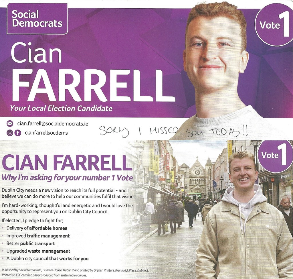 A leaflet from Cian Farrell who is running for The Social Democrats in Dublin’s South East Inner City LEA in the 2024 Local Elections