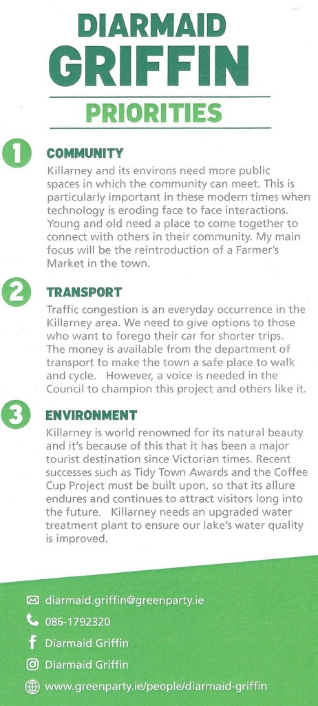 A leaflet from Diarmaid Griffin who is running for The Green Party in Killarney in the 2024 Local Elections.