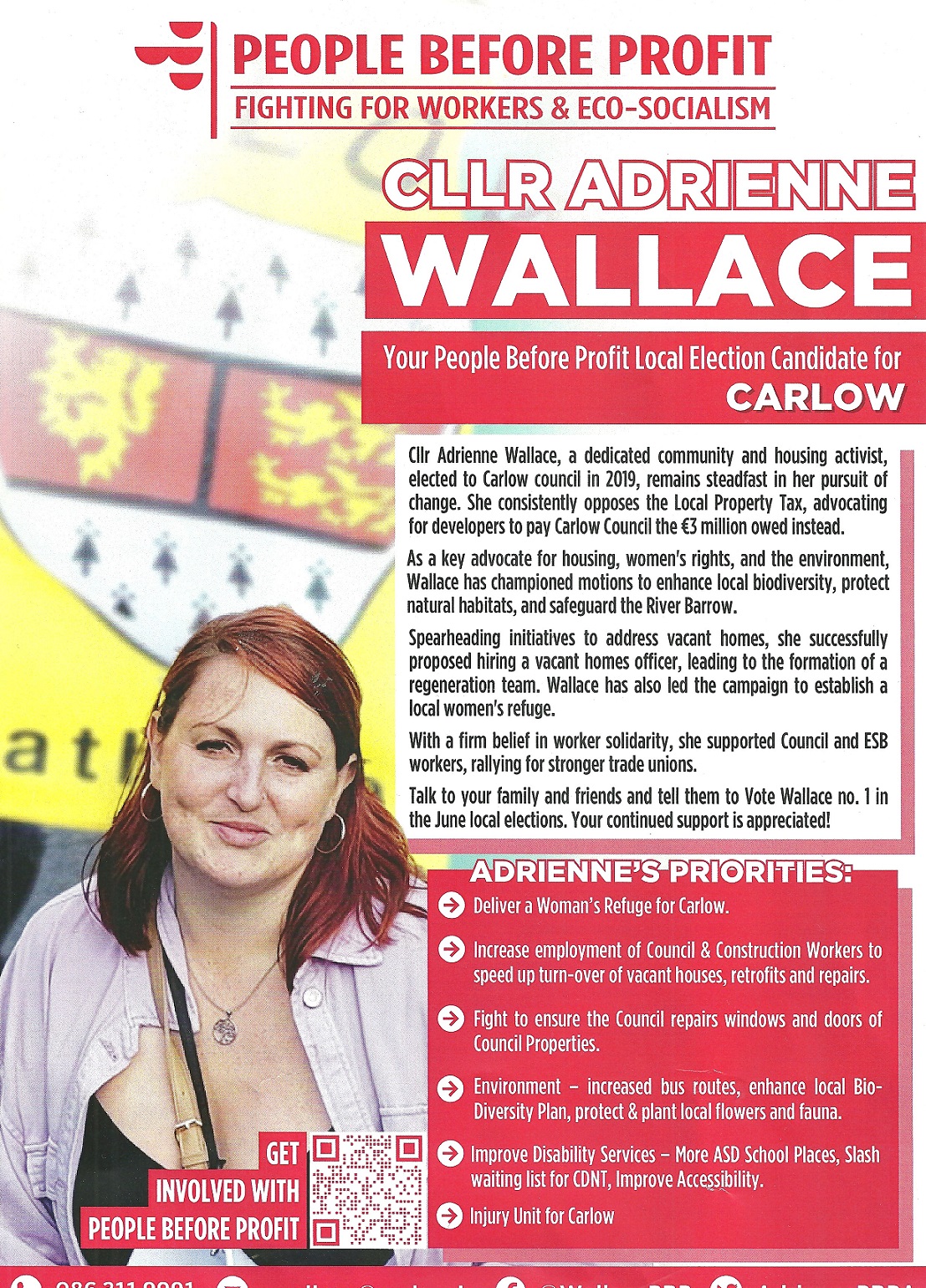 A leaflet from Adrienne Wallace who is running for People Before Profit in Carlow LEA in the 2024 Local Elections.