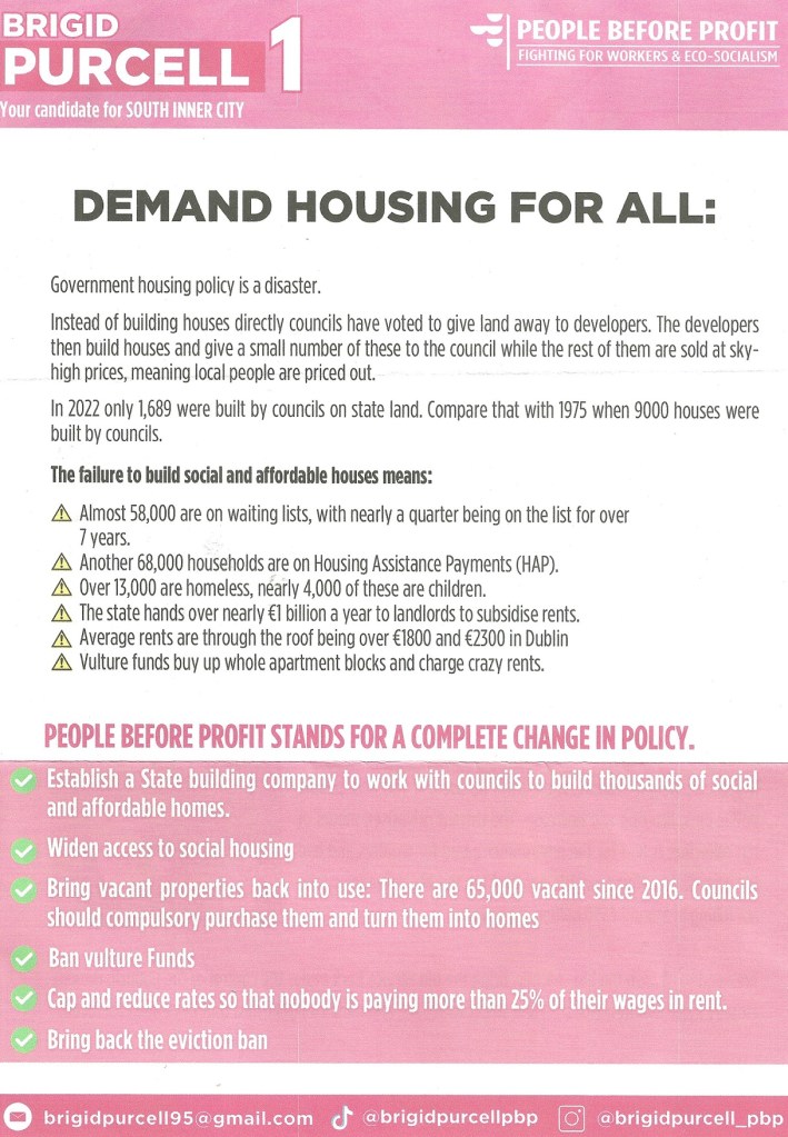 A leaflet from Brigid Purcell who is running for People Before Profit in Dublin’s South East Inner City in the 2024 Local Elections.