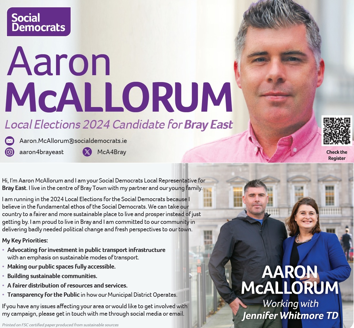 Leaflet from Aaron McAllorum – Social Democrats – Bray East – 2024 Local Elections May 7, 2024