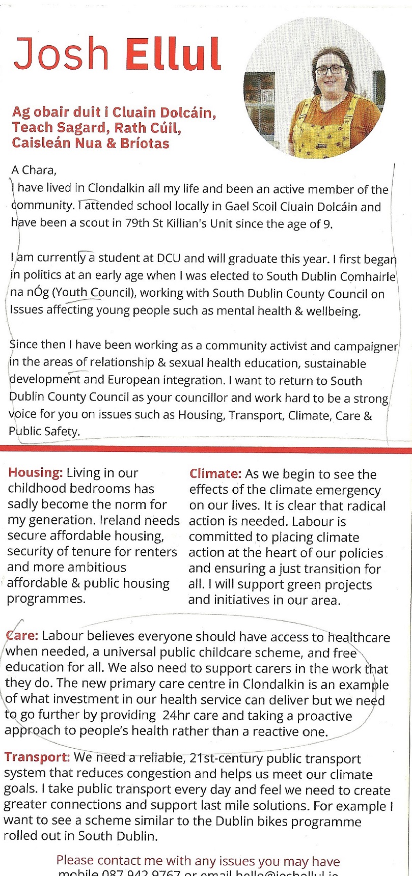A leaflet from Josh Ellul who is running for Labour in Clondalkin in the 2024 Local Elections.