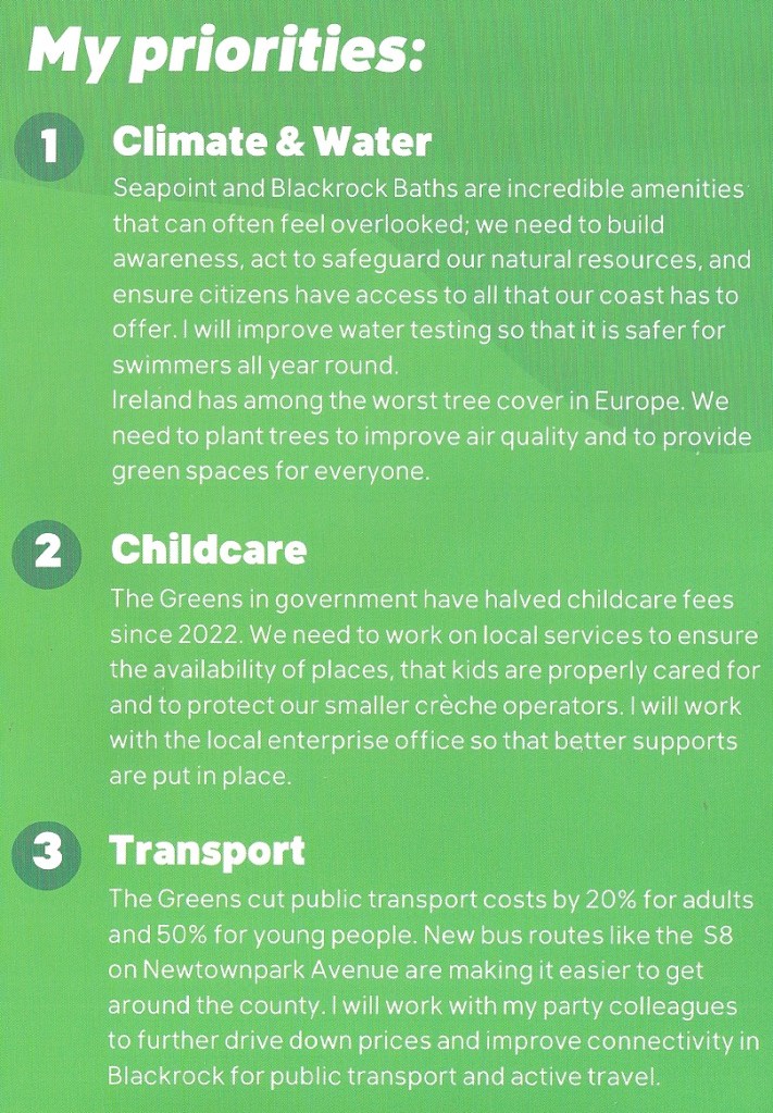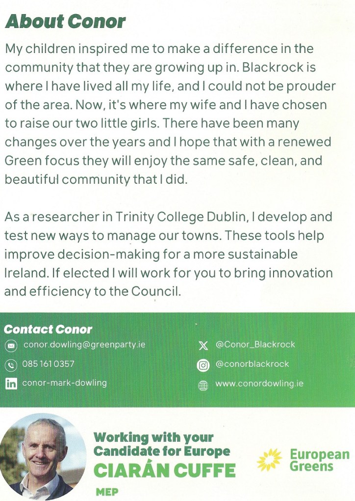 A leaflet from Conor Dowling who is running for the Green Party in Blackrock in the 2024 Local Elections.