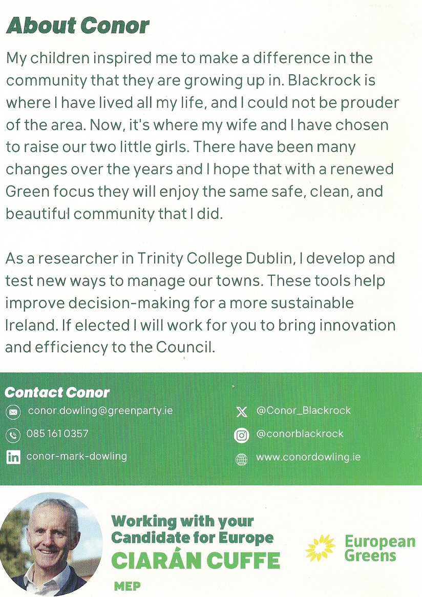 Leaflet from Conor Dowling – Green Party – Blackrock – 2024 Local Elections » conordowling4