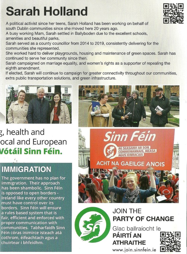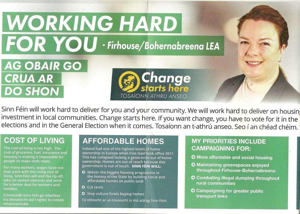 A leaflet from Sarah Holland who is running for Sinn Féin in the Firhouse Bohernabreena LEA in the 2024 Local Elections