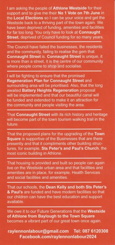 A leaflet from Ray Lennon who is running for Labour in Athlone (Westmeath) in the 2024 Local Elections.