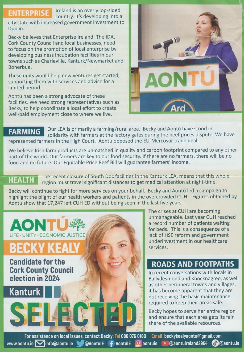 A leaflet from Becky Kealy who is running for Aontú in Kanturk in the 2024 Local Elections.