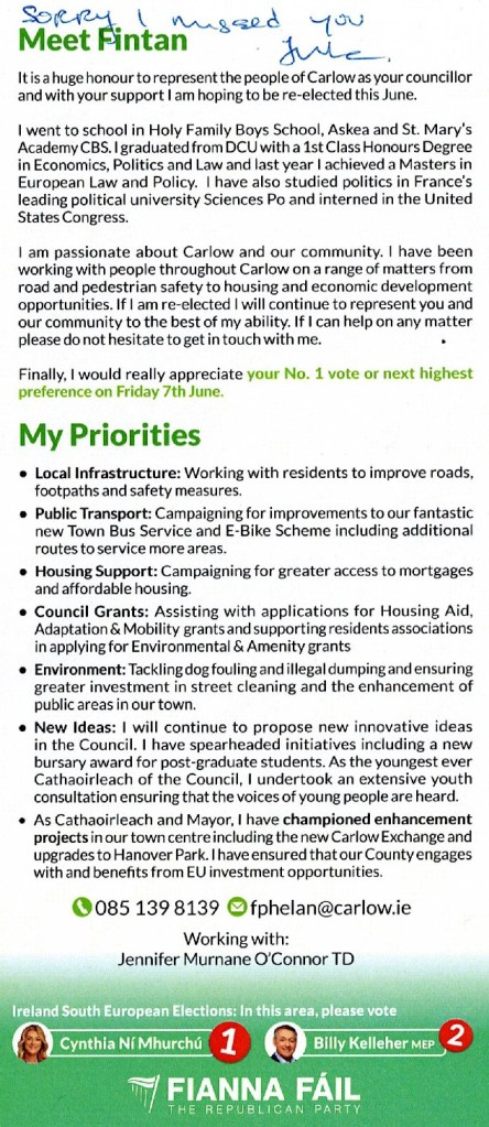 A leaflet from Fintan Phelan who is running for Fianna Fáil in the Carlow LEA in the 2024 Local Elections.
