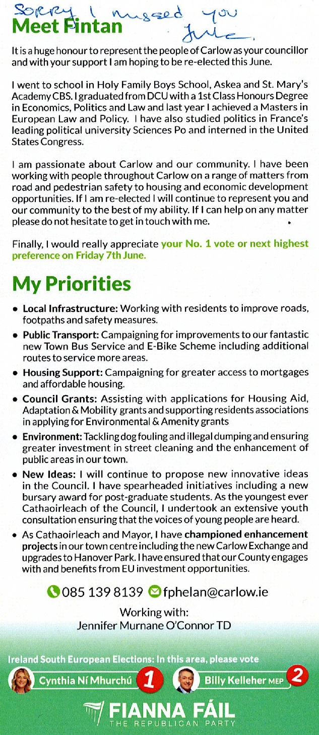 Leaflet from Fintan Phelan – Fianna Fáil – Carlow – 2024 Local Elections » fintanphelanle24ab