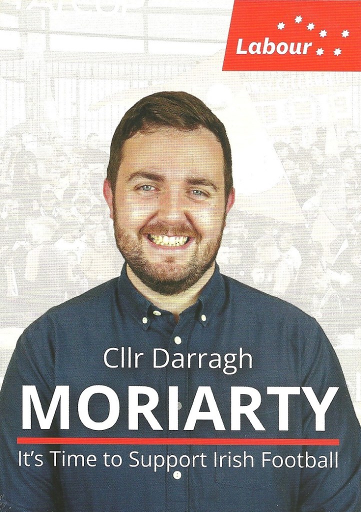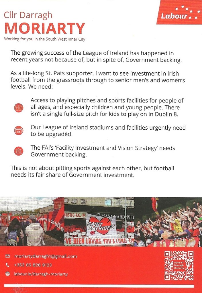 A ‘Support Irish Football’ leaflet from Pats fan and Labour candidate Darragh Moriarty who is running in Dublins’ South West Inner City LEA in the 2024 Local Elections