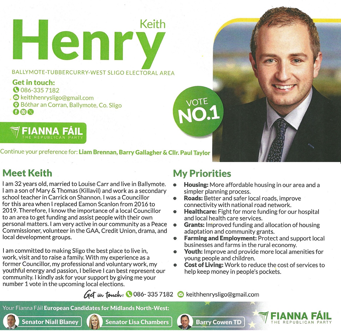A leaflet from Keith Henry who is running for Fianna Fáil in The Ballymote Tubbercurry LEA in the 2024 Local Elections