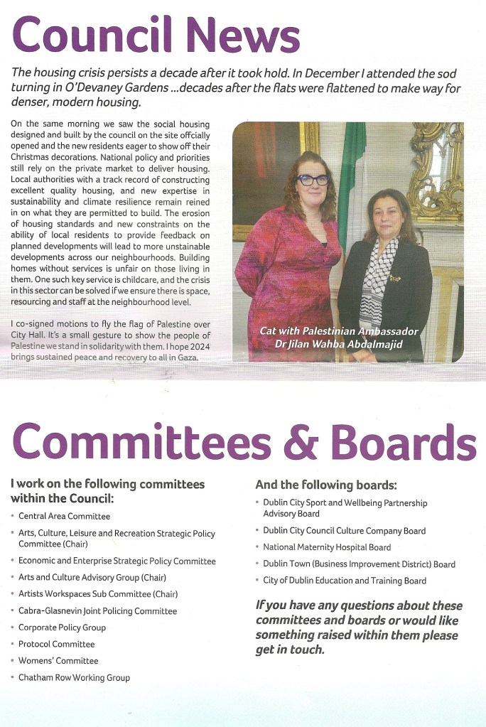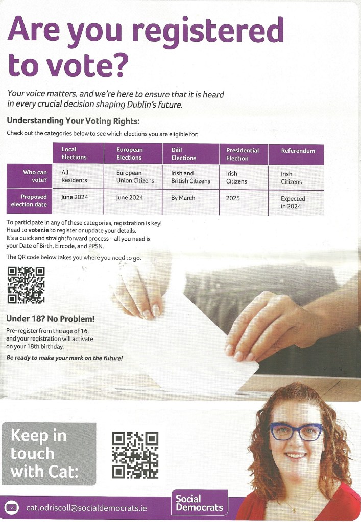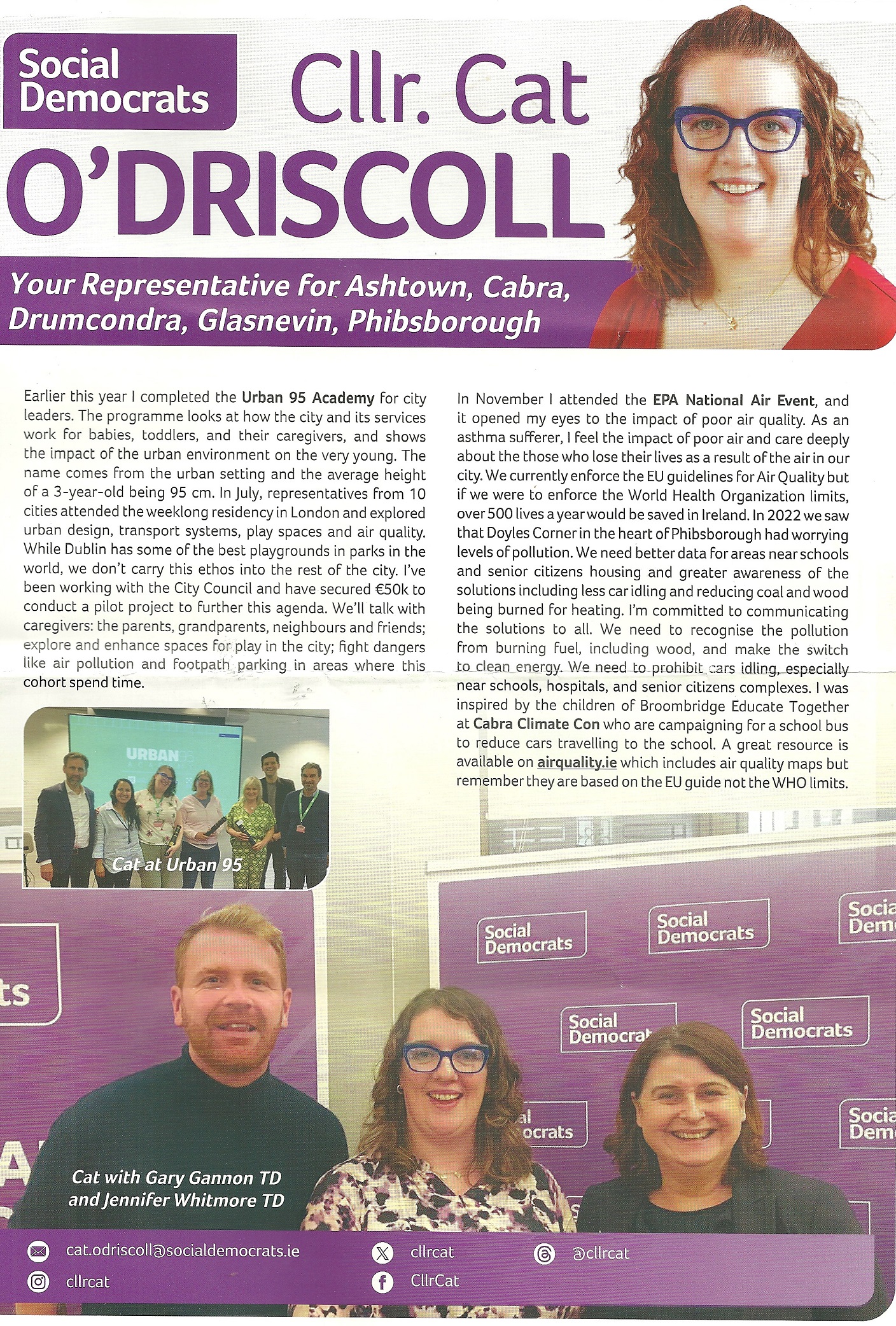 A leaflet from Cat O’Driscoll who is running for The Social Democrats in Cabra Glasnevin in the 2024 Local Elections.