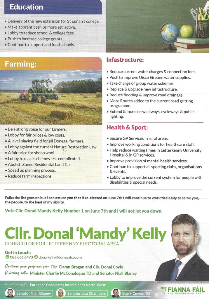 A leaflet from Donal ‘Mandy’ Kelly who is running for Fianna Fáil in Letterkenny in the 2024 Local Elections.