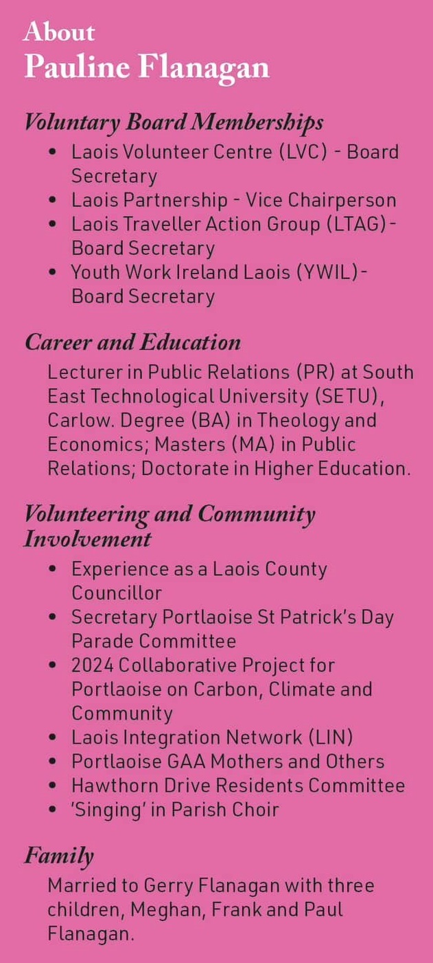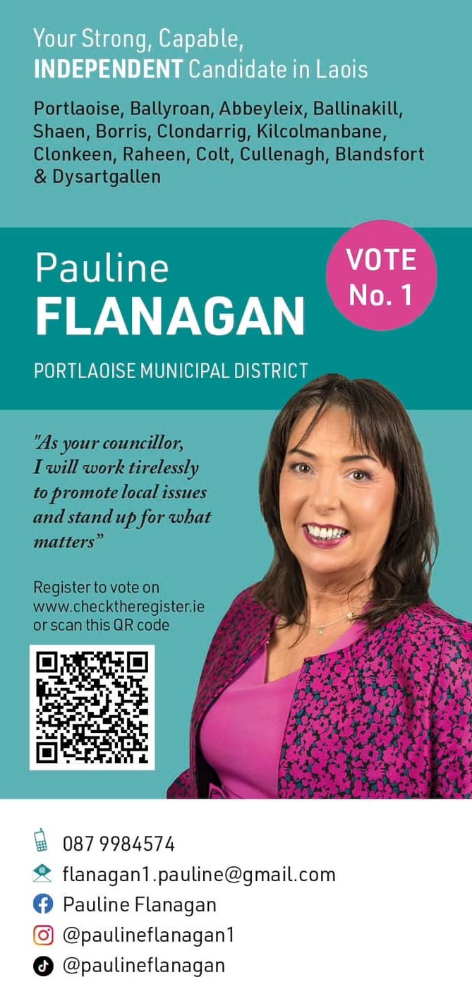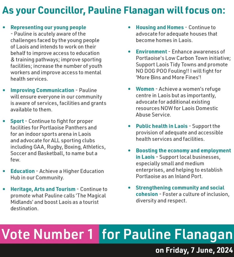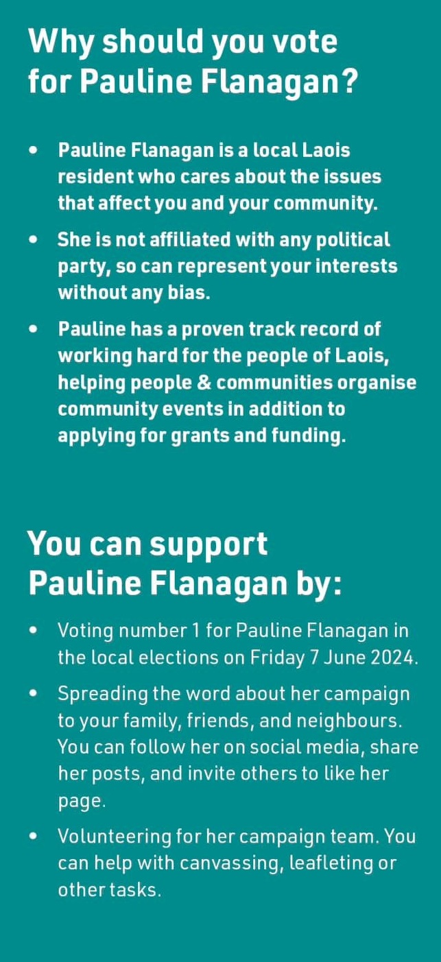A leaflet from Pauline Flanagan who is running as an Independent in Portlaoise in the 2024 Local Elections