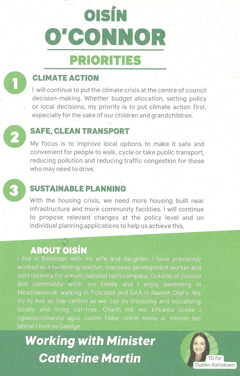 A leaflet form Oisín O’Connor who is running for The Green Party in Glencullen Sandyford in the 2024 Local Elections.
