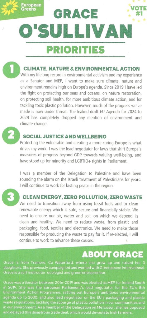 A leaflet from Grace O’Sullivan who is running for the Green Party in Ireland South.