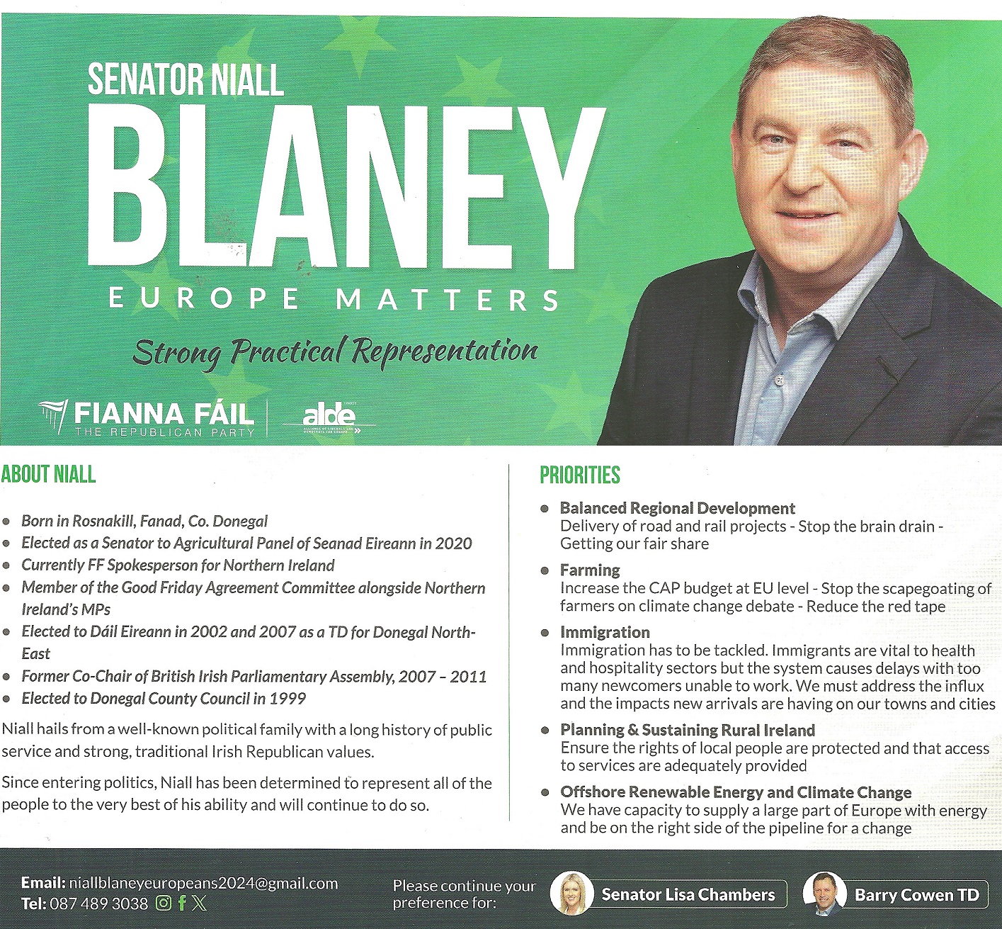 A leaflet from Niall Blaney who is running for Fianna Fáil in the Midlands North West constituency in the 2024 European Elections