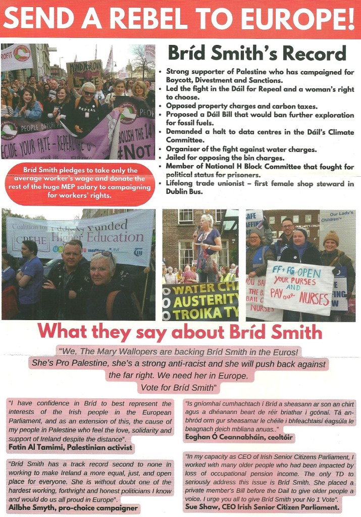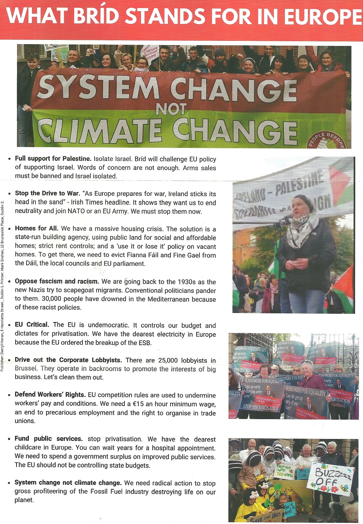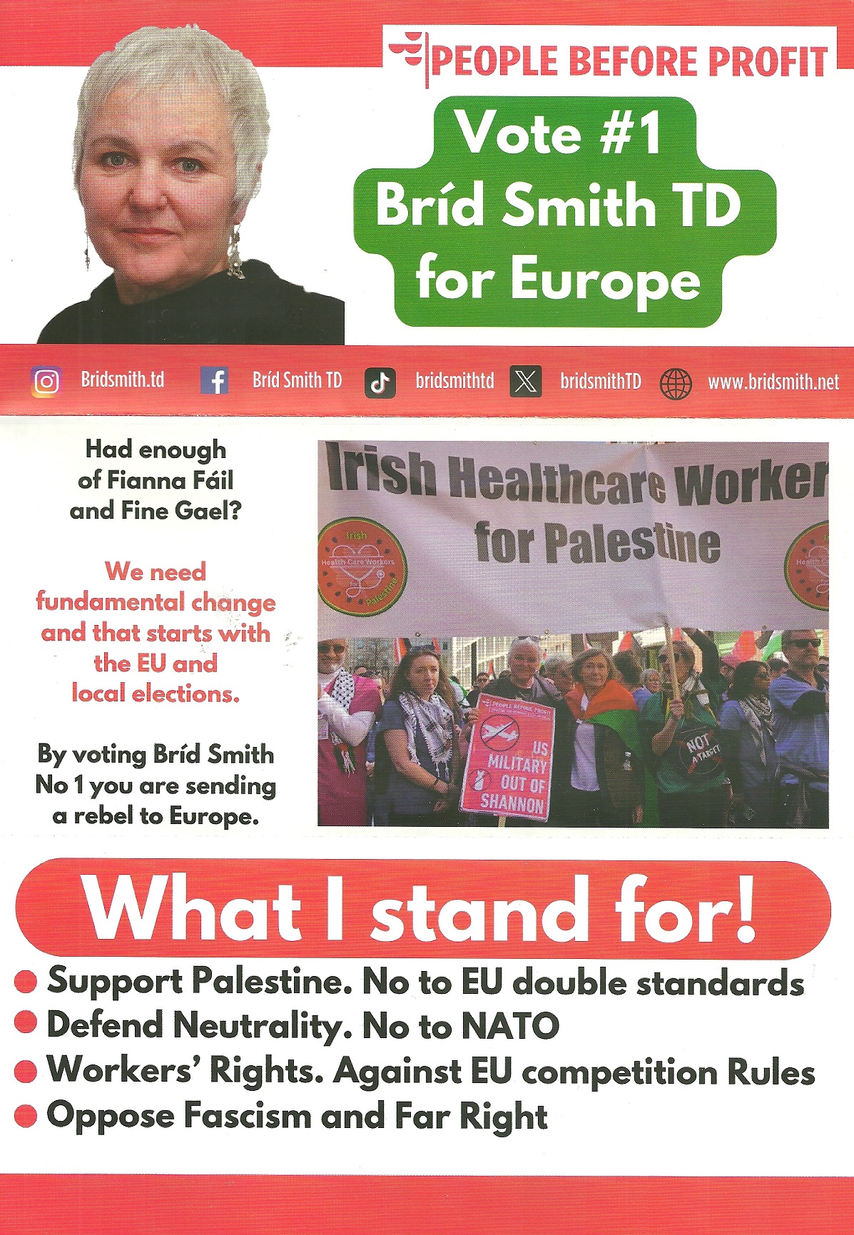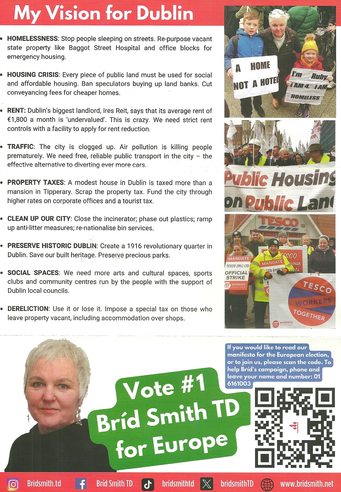 A leaflet from Bríd Smith who is running for People Before Profit in Dublin in the 2024 European Elections.