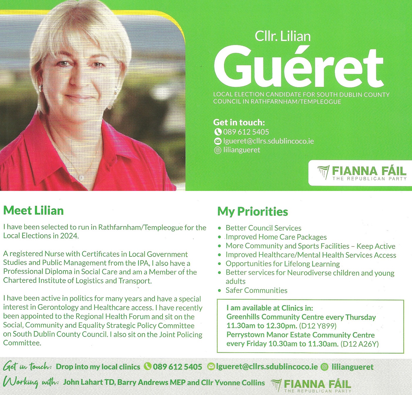 A leaflet from Lilian Guéret who is running for Fianna Fáil in Rathfarnham Templeogue in the 2024 Local Elections.