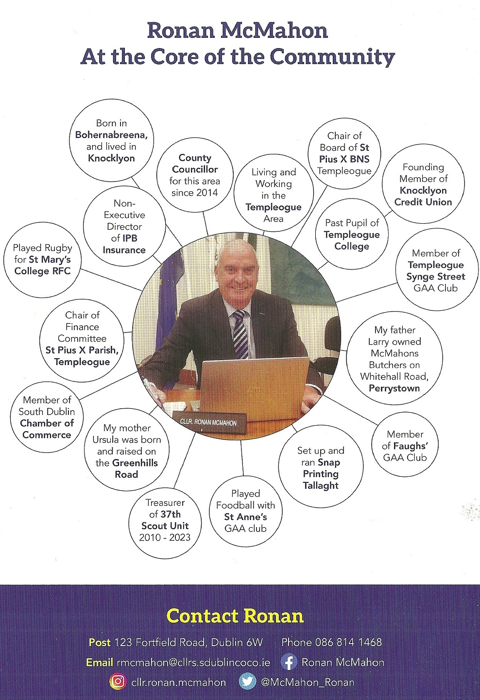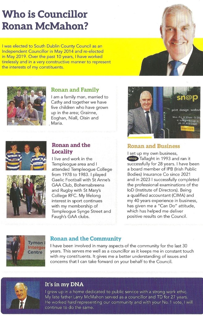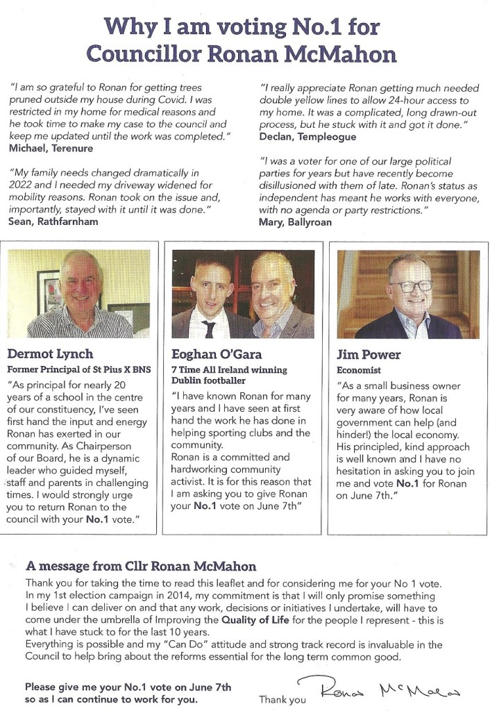A leaflet from Ronan McMahon who is running as an Independent in Rathfarnham Templeogue in the 2024 Local Elections