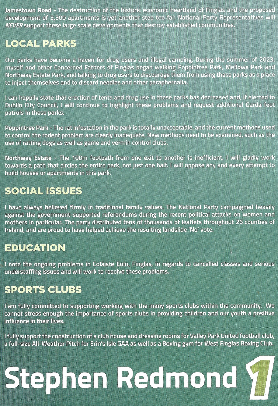 Leaflet from Stephen Redmond – The National Party – Ballymun Finglas – 2024 Local Elections » stephenredmondle24c