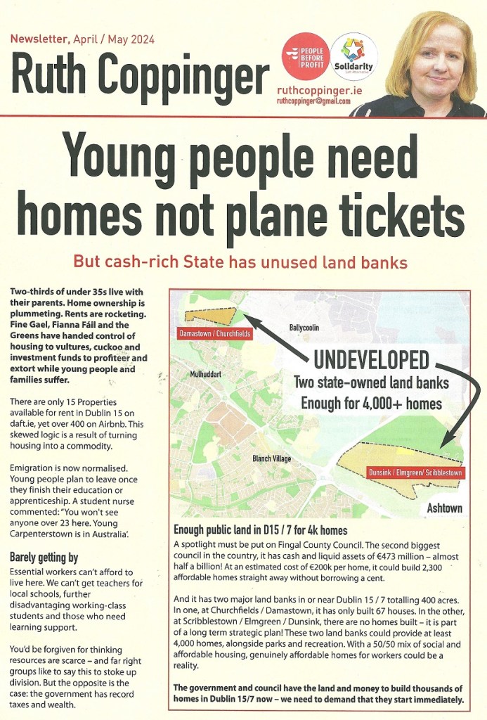 Leaflet from Ruth Coppinger of The Socialist Party who is running as a Solidarity People Before Profit candidate in Castleknock in the 2024 Local Elections.