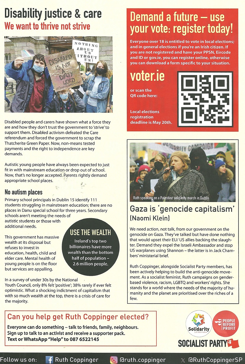 Leaflet from Ruth Coppinger – Solidarity People Before Profit – Castleknock – 2024 Local Elections » ruthcoppingerle24b