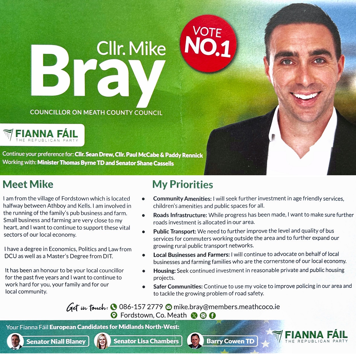 Leaflet from Mike Bray – Fianna Fáil – Kells – 2024 Local Elections » mikebrayle24