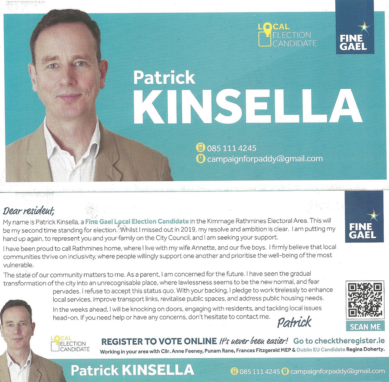 A leaflet from Patrick Kinsella who is running for Fine Gael in Kimmage Rathmines in the 2024 Local Elections