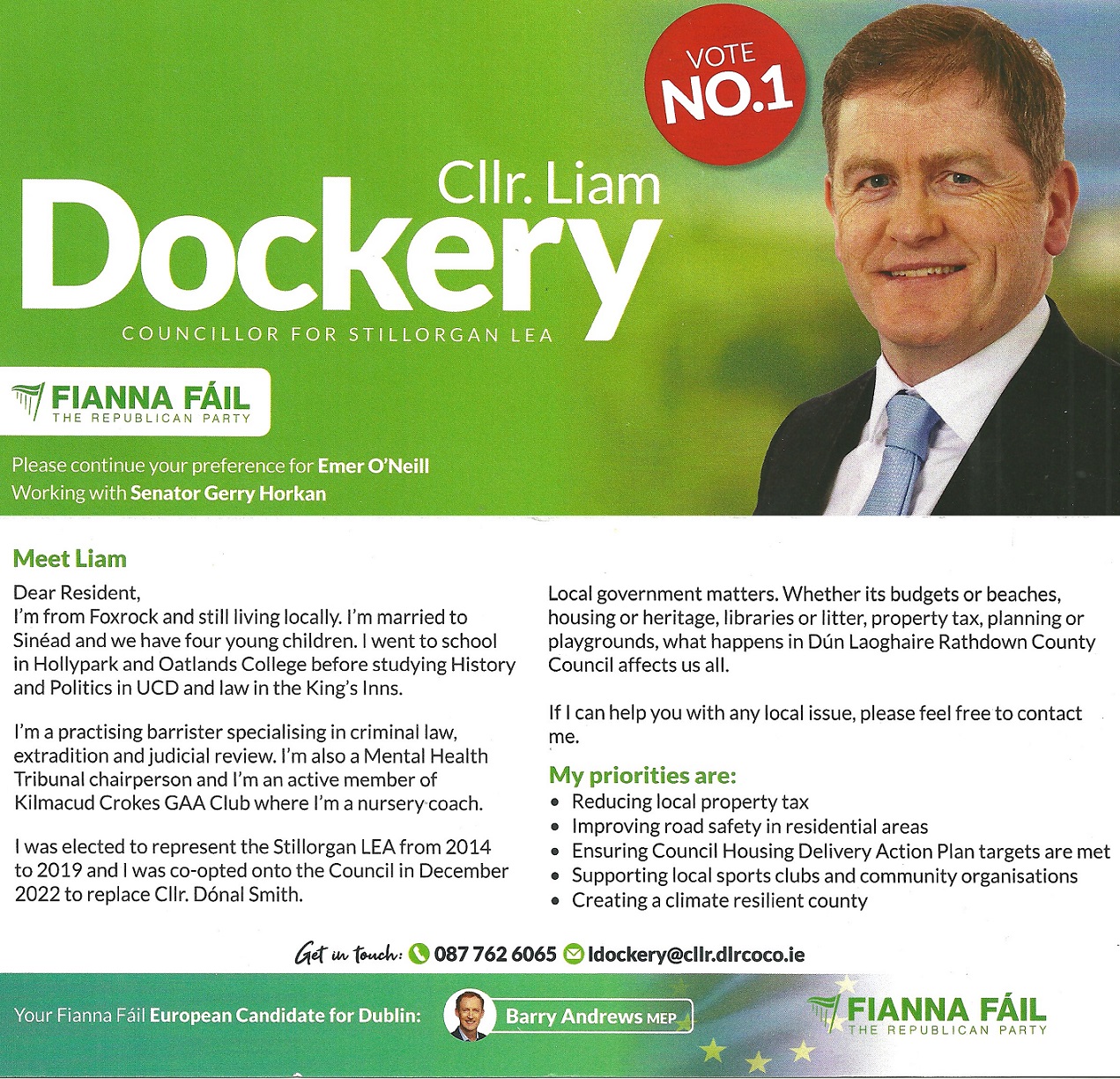 A leaflet from Liam Dockery who is running for Fianna Fáil in Stillorgan in the 2024 Local Elections.