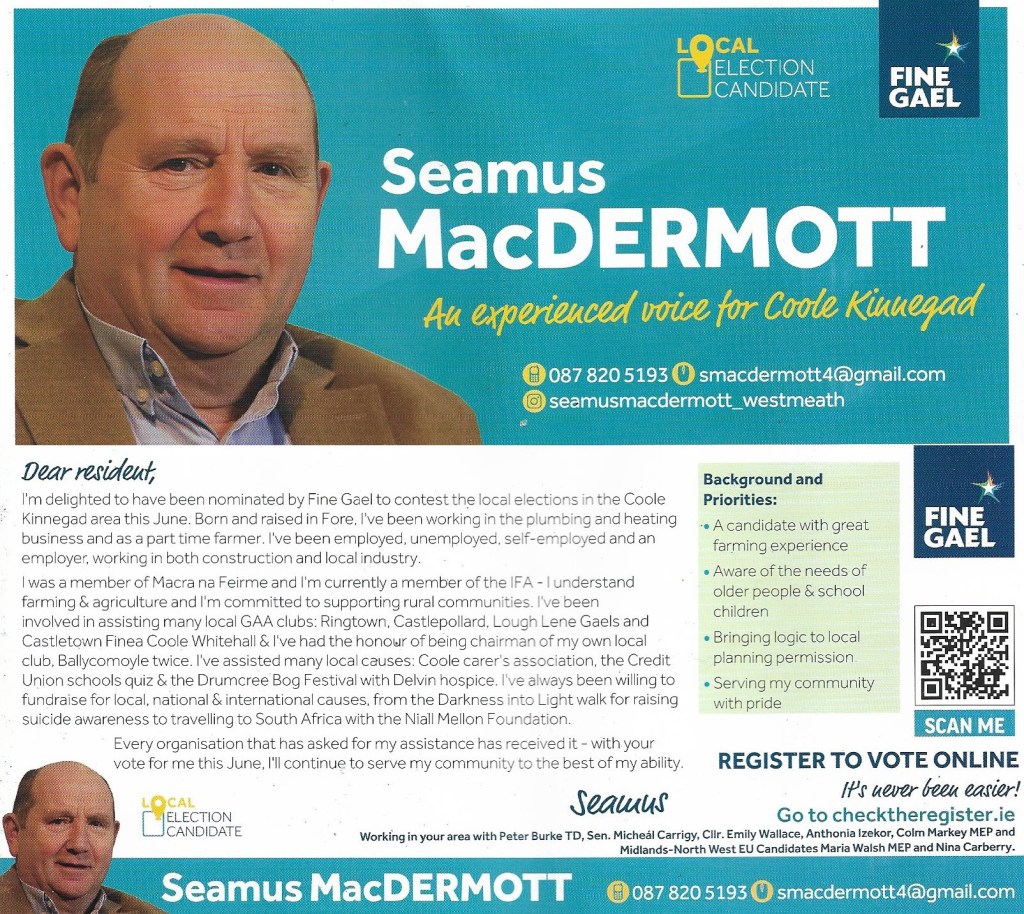 Leaflet from Seamus MacDermott – Fine Gael – Kinnegad – 2024 Local Elections May 26, 2024