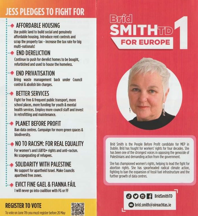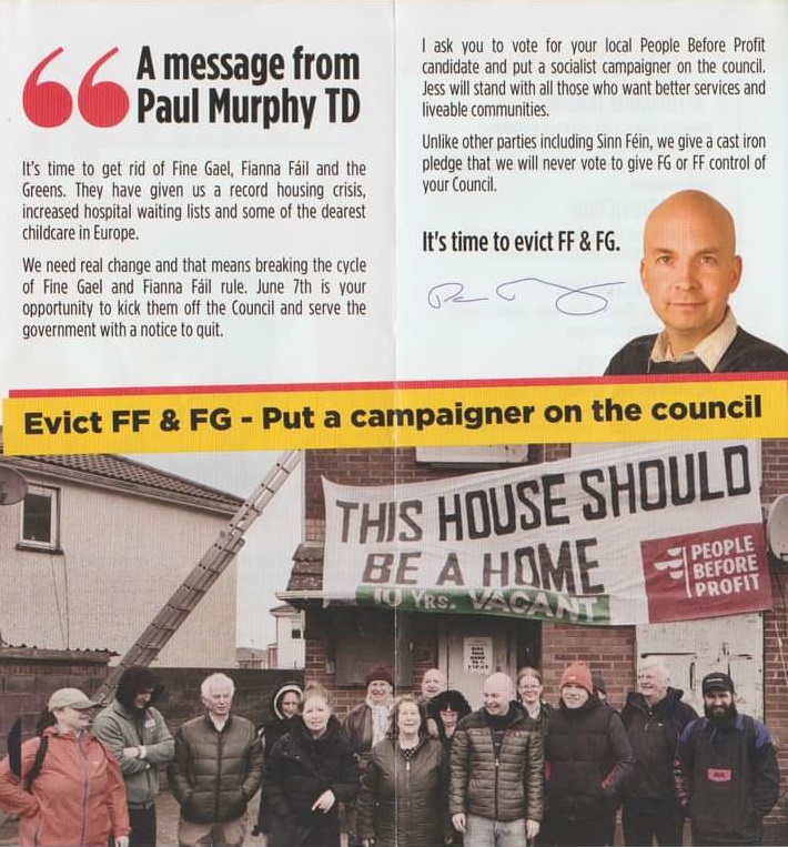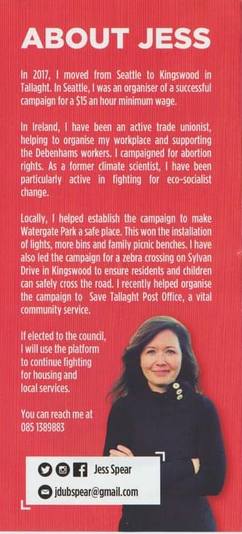 A leaflet from Jess Spear who is running for People Before Profit in Tallaght Central in the 2024 Local Elections