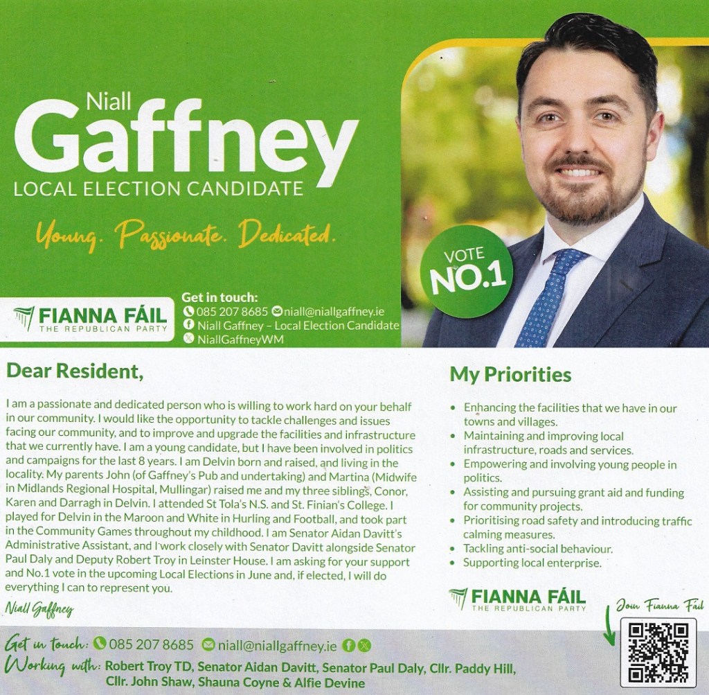 A leaflet form Niall Gaffney who is running for Fianna Fáil in Kinnegad in the 2024 Local Elections.