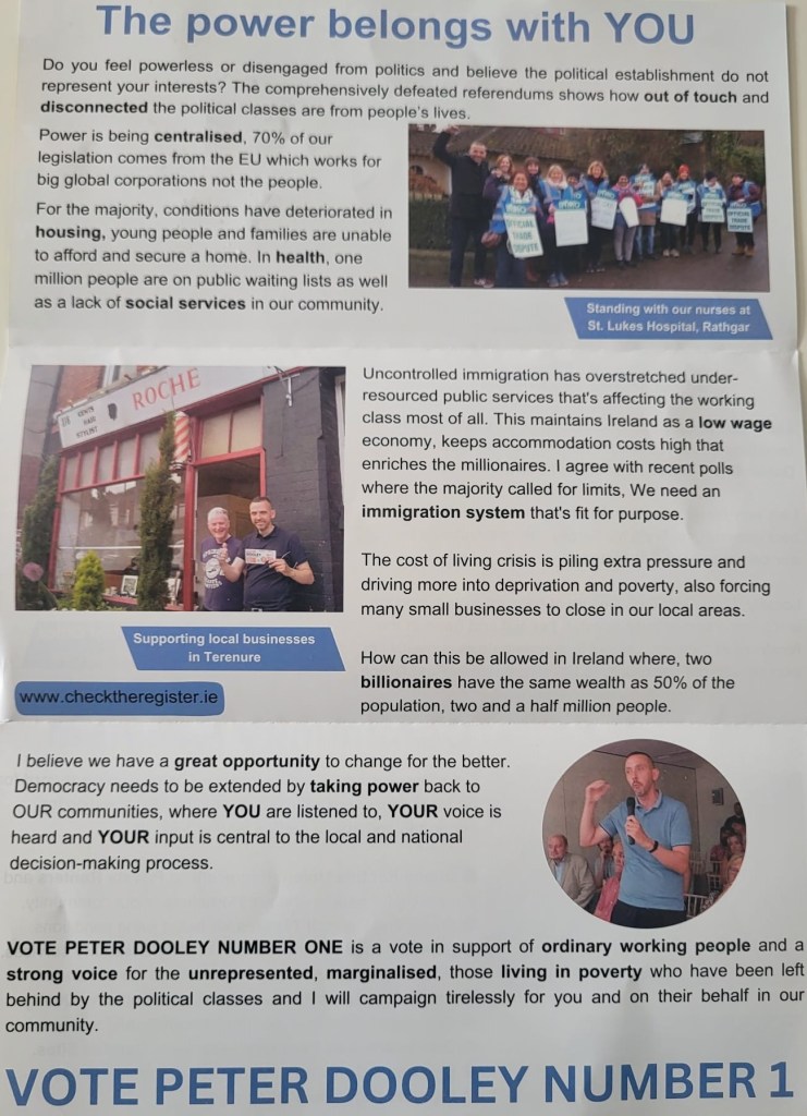A leaflet from Peter Dooley who is running as an Independent in Kimmage Rathmines in the 2024 Local Elections