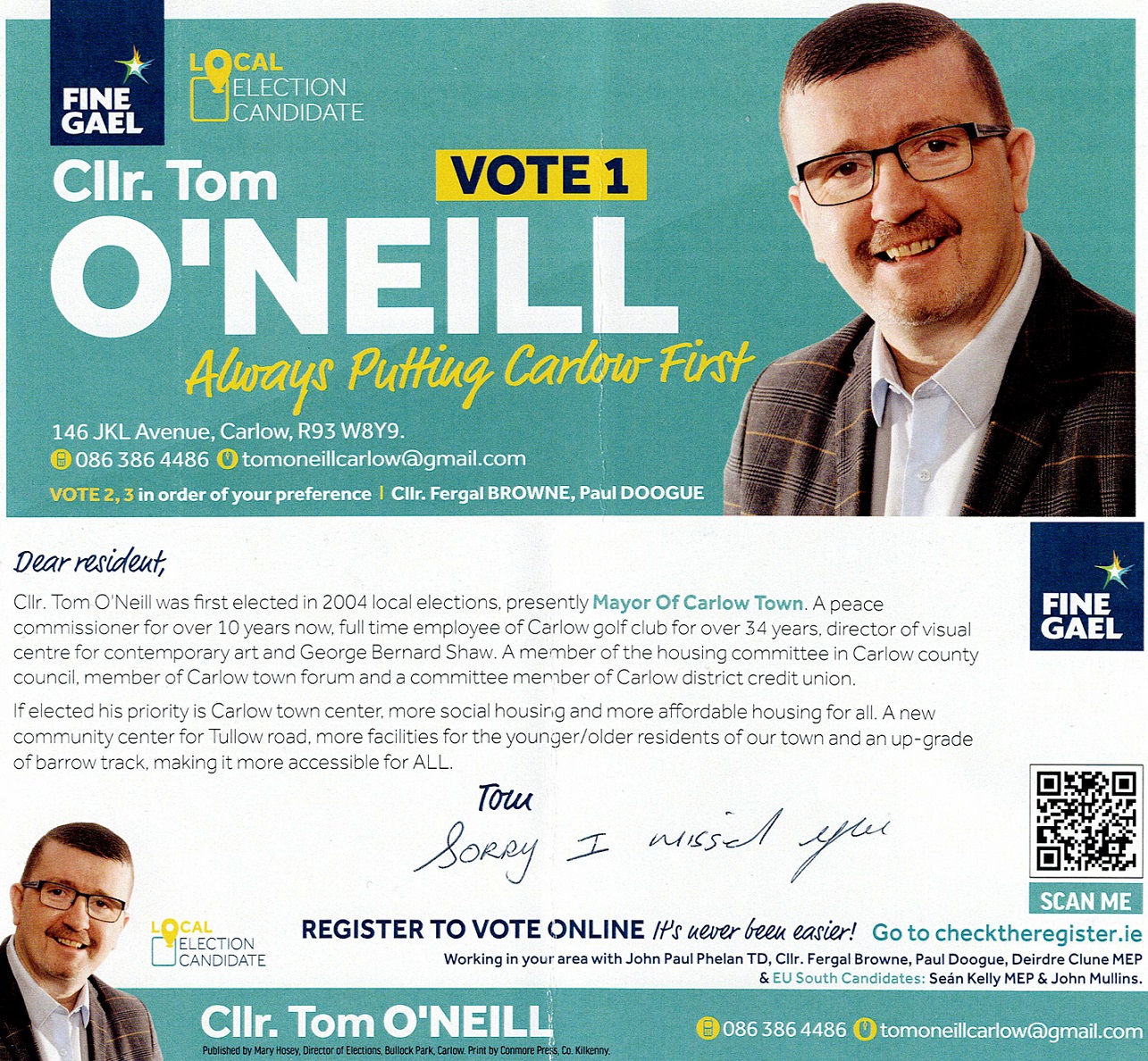 A leaflet from Tom O’Neill who is running for Fine Gael in Carlow in the 2024 Local Elections