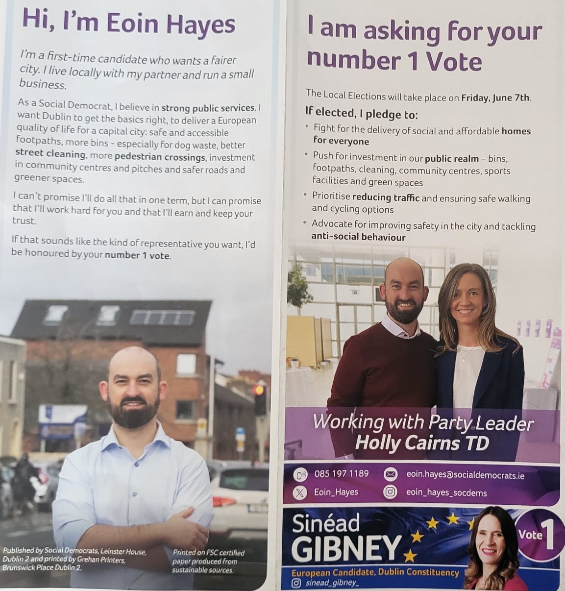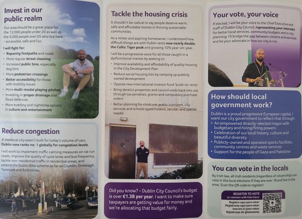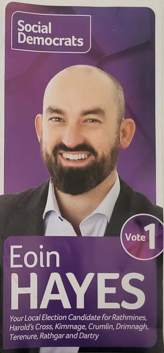 A leaflet from Eoin Hayes who is running for The Social Democrats in Kimmage Rathmines in the 2024 Local Elections